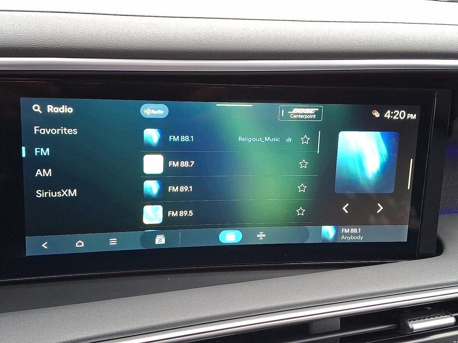- Radio: Infotainment Navigation System -inc: Bose 14-speaker premium audio system w/Centerpoint and SoundTrue enhanced technology, 12.3" color touchscreen, wireless Apple CarPlay and Android Auto, HD Radio, Sirius XM, Passenger Talk 2.0 in-car intercom system, dynamic voice recognition, rear seat quiet mode, Bluetooth® hands-free w/wireless audio streaming, multiple device connection (up to 2 devices), USB connectivity, Bluelink + connected car services, Wi-Fi hotspot, steering wheel audio controls and Over-the-Air (OTA) software updates