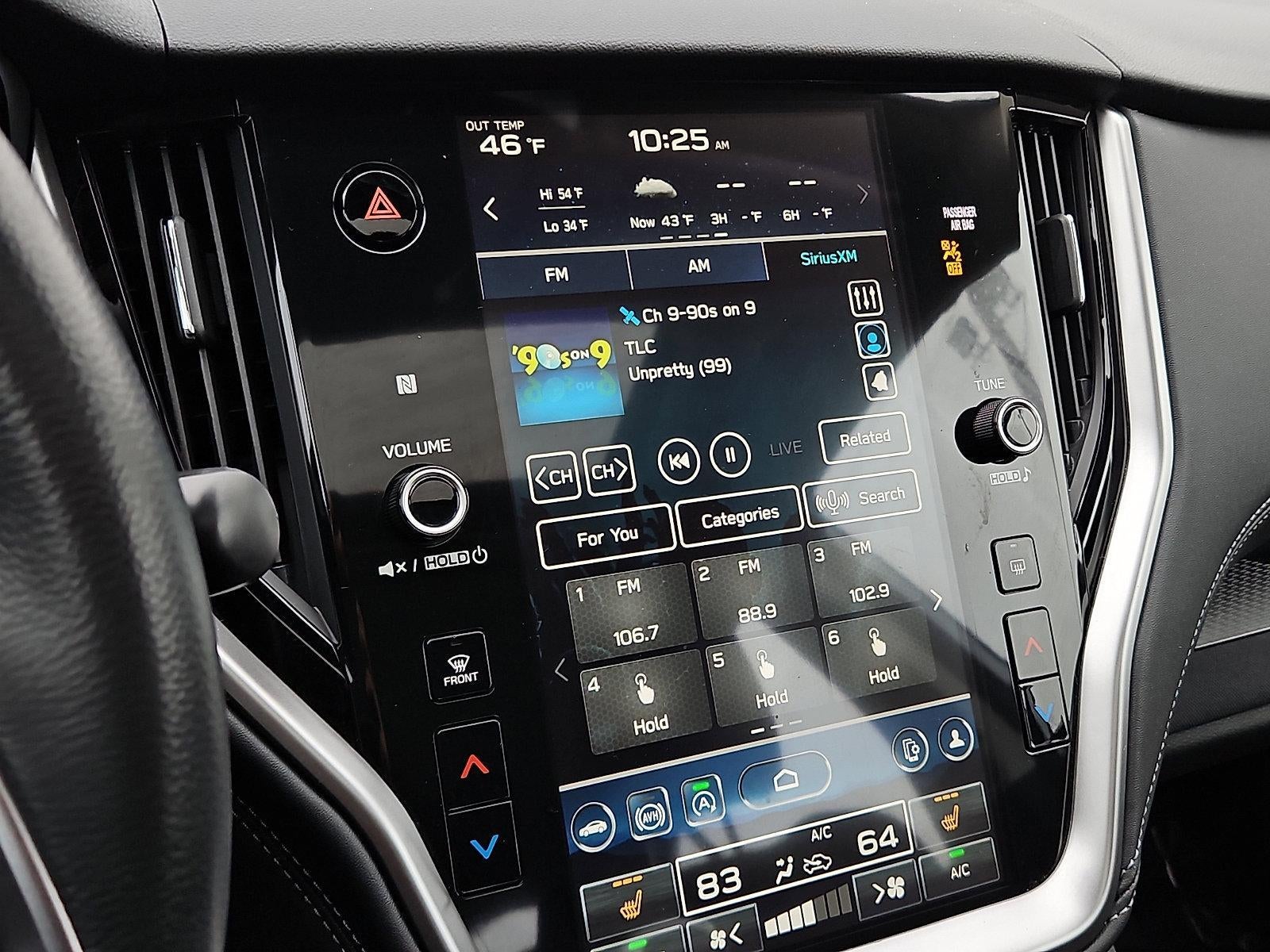 - Radio: Subaru STARLINK 11.6" Multimedia Plus Sys -inc: AM/FM stereo, HD Radio, valet mode, multi-touch gesture high resolution display screen, voice activated controls, Bluetooth® audio streaming and hands-free phone connectivity w/SMS text messaging (refer to subaru.com for cell phone compatibility), Near Field Communication (NFC), iPod control capability, SiriusXM w/360L (4 months free platinum trial/subscription required after; available after launch, possibly in June 2023), SiriusXM Travel Link (4 months free trial/subscription required after), smartphone integration w/full screen view and wireless connection for Android Auto, Apple CarPlay and STARLINK cloud applications (refer to subaru.com for app availability), USB and Over The Air (OTA) audio system update, audio/Bluetooth® steering wheel control switches, 6 speakers, 3.5mm illuminated front auxiliary input jack and illuminated front and rear USB-A and USB-C input/charge ports